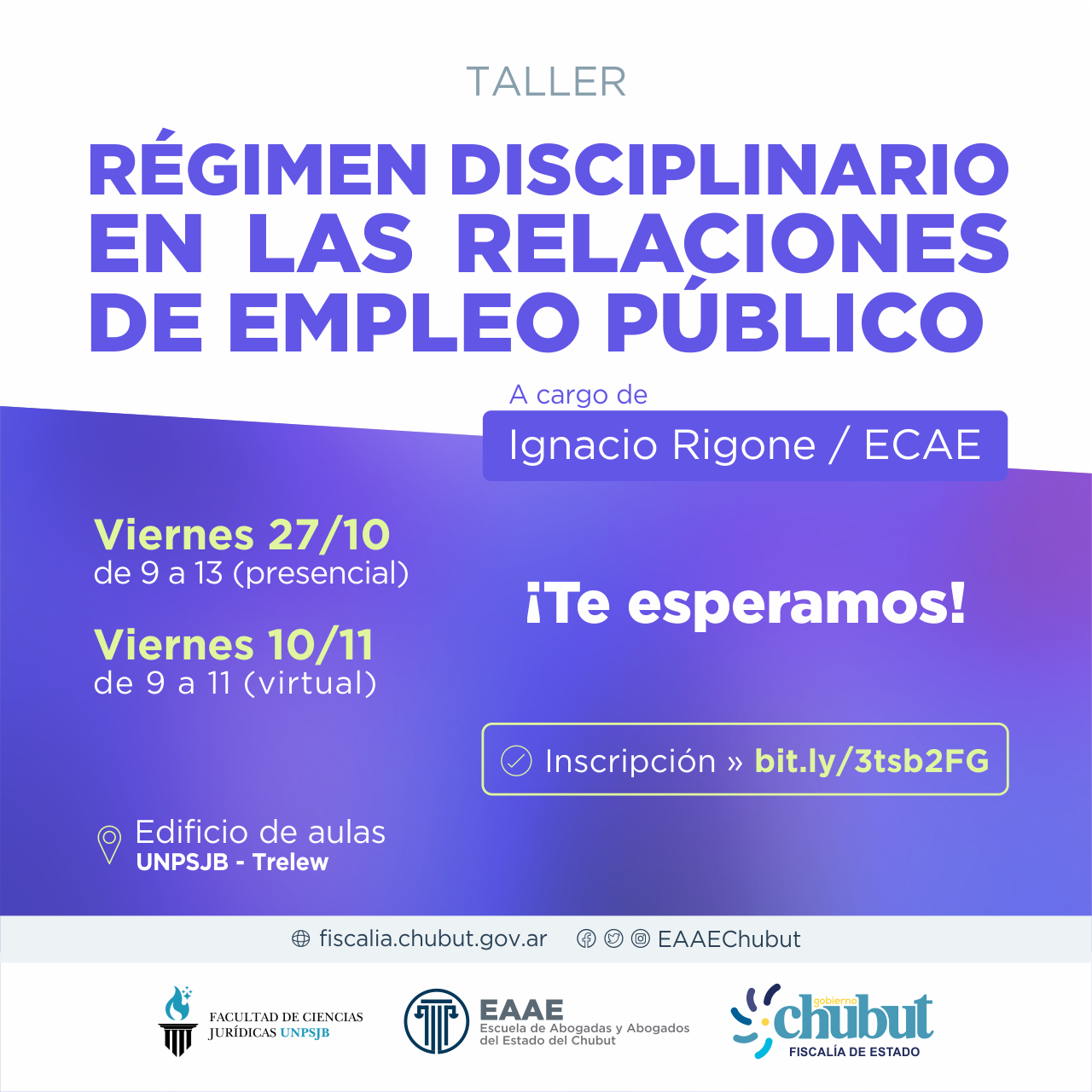 El 27 la clase será presencial, en el edificio de aulas de la Facultad de Ciencias JurÃdicas, sede Trelew, merced a un convenio de colaboración mutua; y el 10 será virtual. Quienes presten funciones en el Estado provincial podrán inscribirse en bit.ly/3tsb2FG o a través del link publicado en las redes sociales de la EAAE del Chubut.
