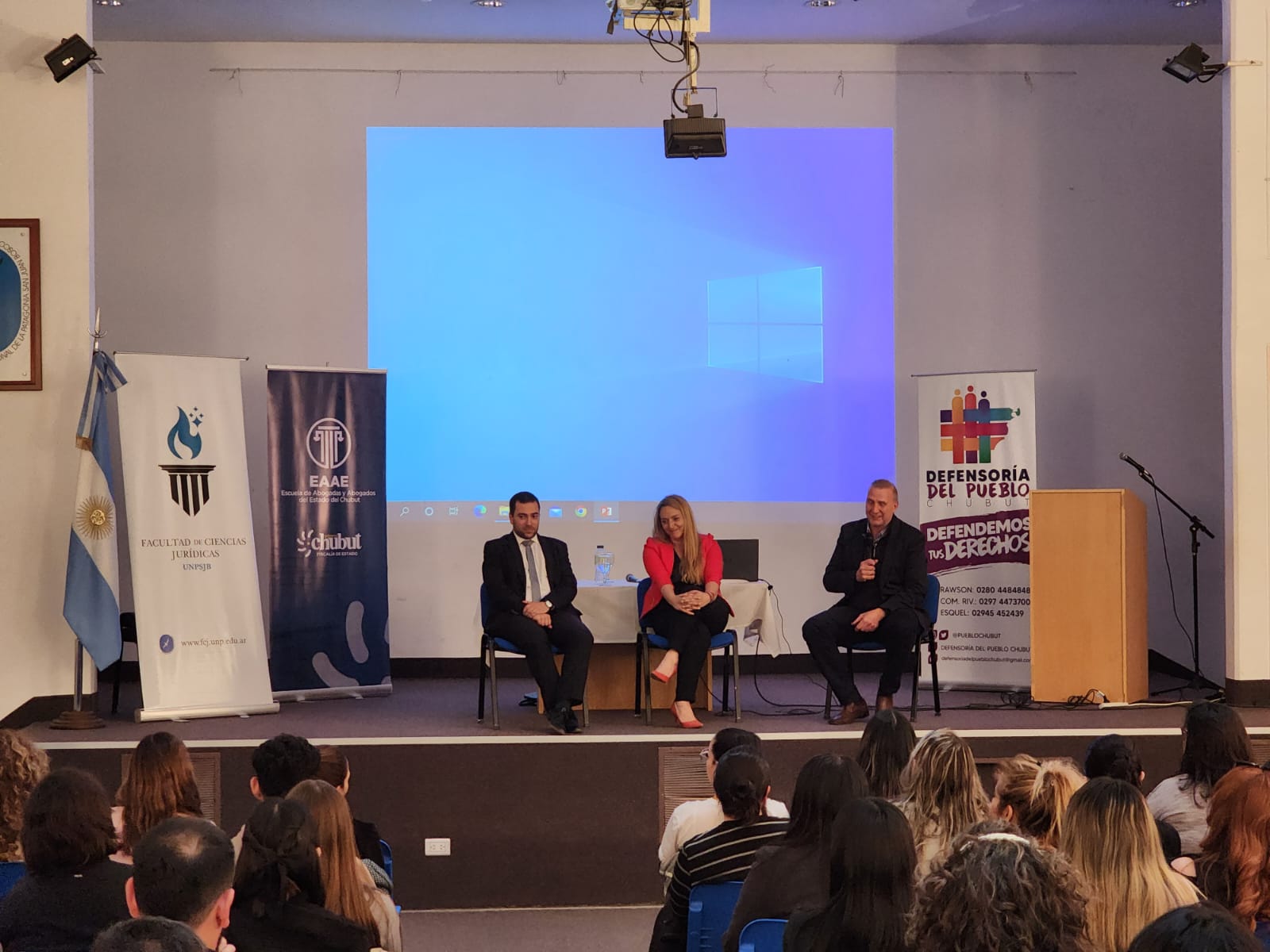 En el encuentro, que se desarrolló en el Aula Magna de la UNPSJB, participó el director de la EAAE y Fiscal de Estado, Andrés Giacomone y la defensora Claudia Bard.